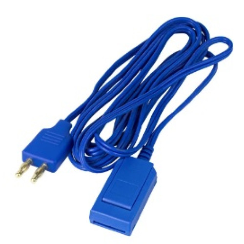 Cabo reutilizável para a conexão dos modelos de placa eletrocautério que não possuem cabo ao gerador eletrocirúrgico, possui plug 2 pino (conectar no eletrocautério) e adaptador lingueta de placa (conectar na placa) e 3 metros de extensão.